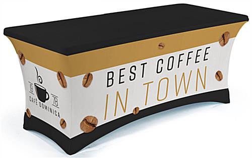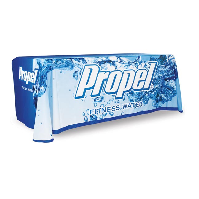 Print custom table covers for standard 6’ and 8' tables at trade shows, conventions, and other indoor events.